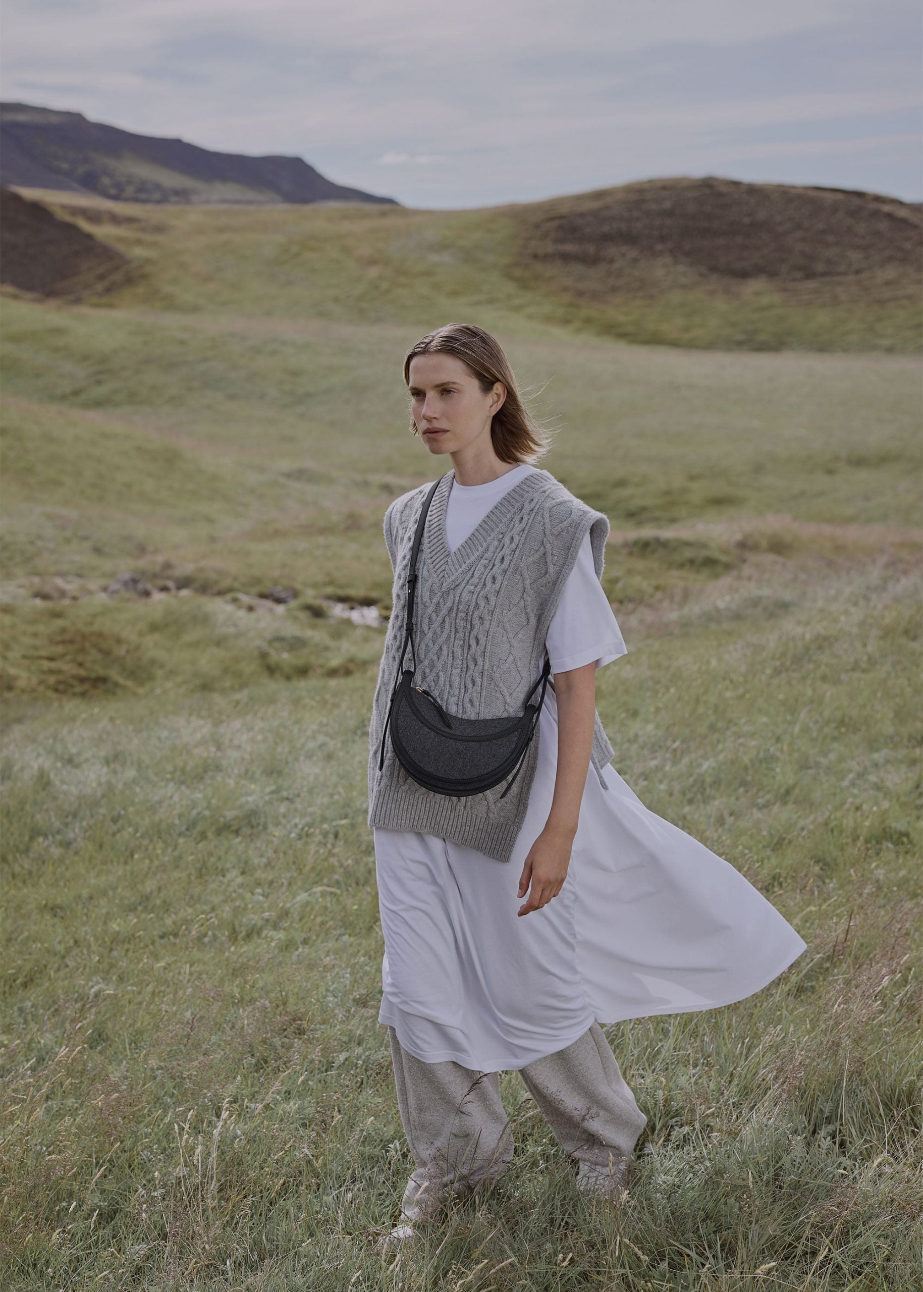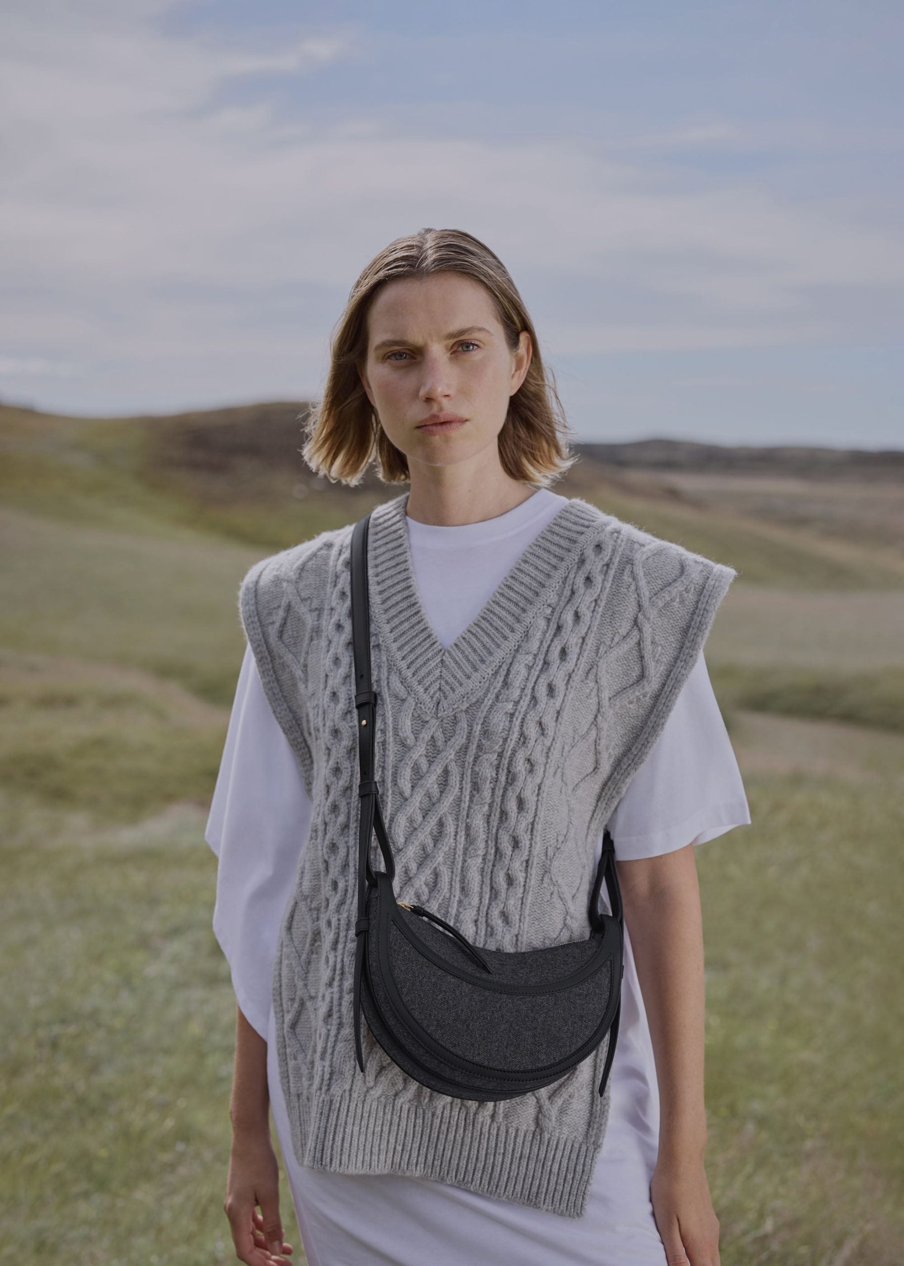 Avec sa forme arrondie, son rembourrage en mousse et ses coutures main, le « Numéro Dix » est un clin d’œil aux codes équestres de la sellerie. Son design en demi-lune met en valeur la juxtaposition des courbes.