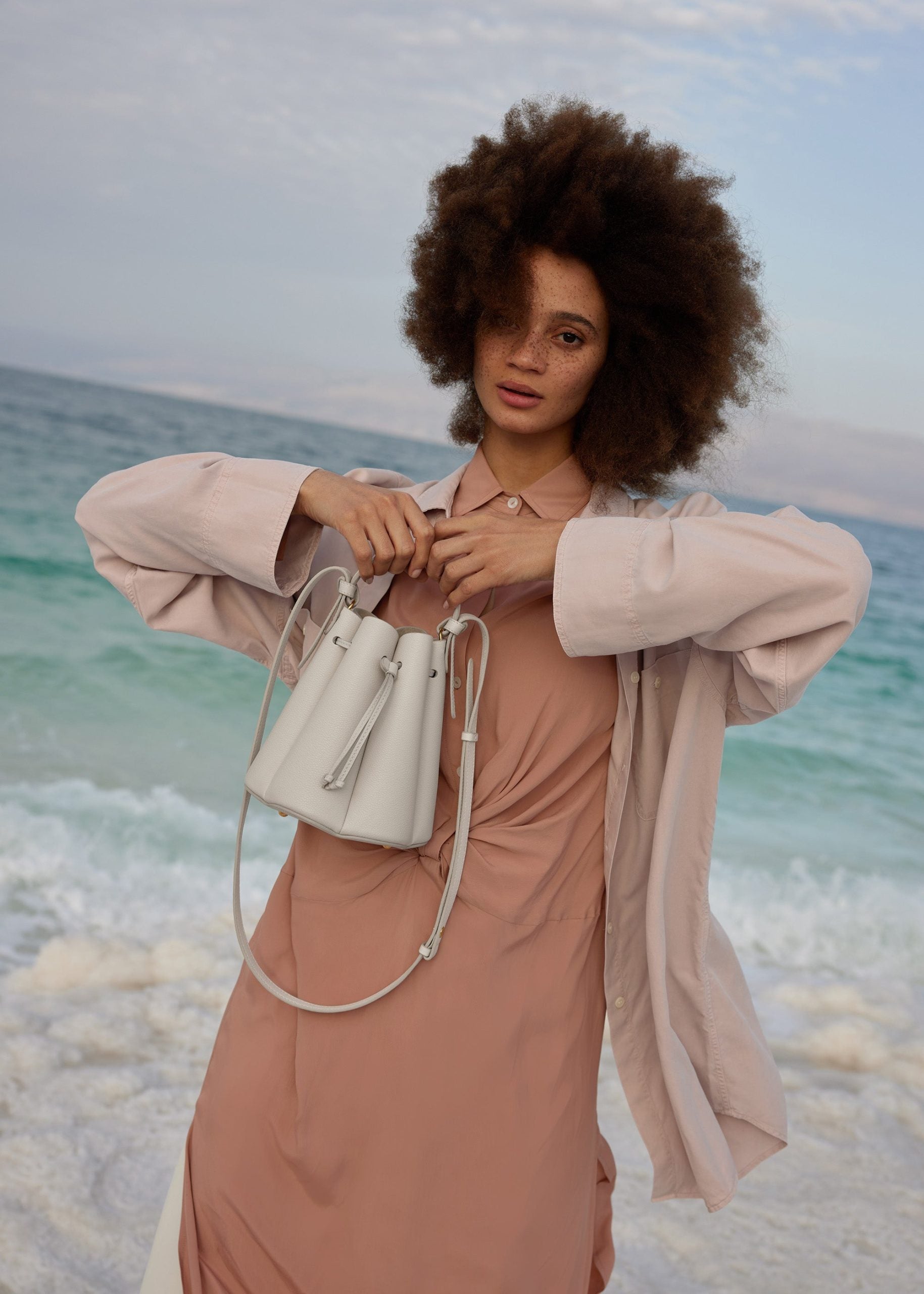 Le « Numéro Huit » est un sac seau en forme de fleur. Ses lignes sculpturales sont obtenues grâce à des ondulations de cuir créant un effet cannelé.
