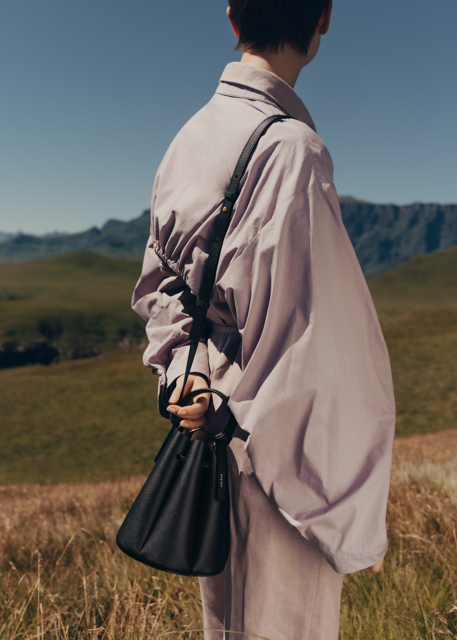 Le « Numéro Huit » est un sac seau en forme de fleur. Ses lignes sculpturales sont obtenues grâce à des ondulations de cuir créant un effet cannelé.