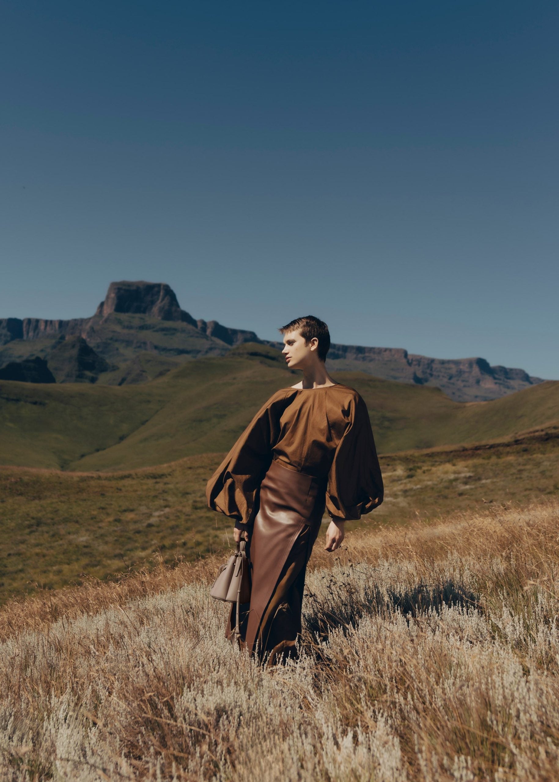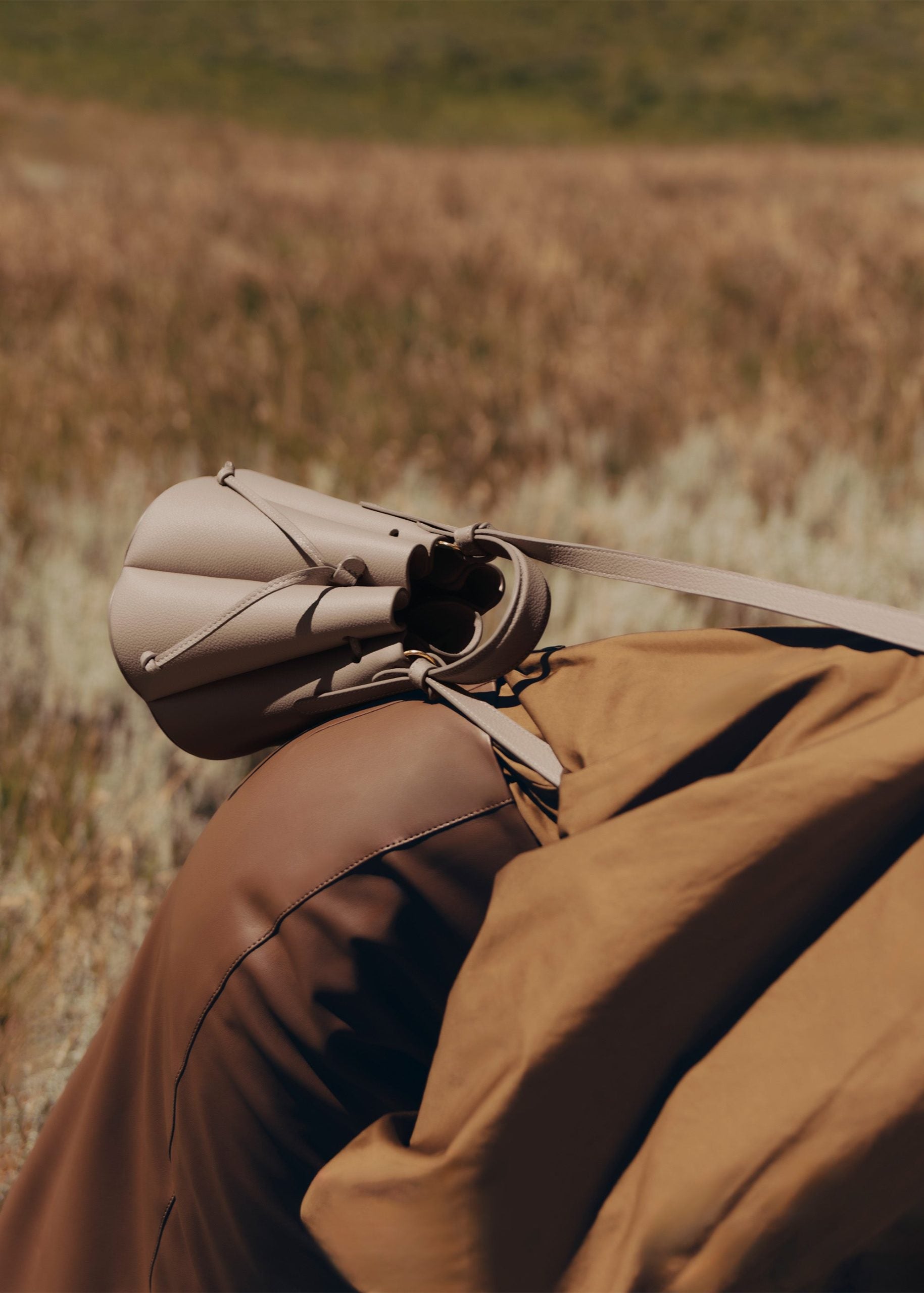 Le « Numéro Huit » est un sac seau en forme de fleur. Ses lignes sculpturales sont obtenues grâce à des ondulations de cuir créant un effet cannelé.